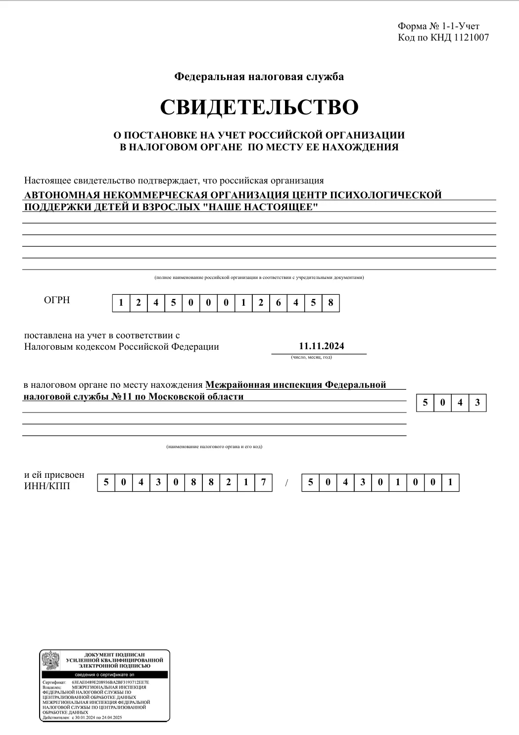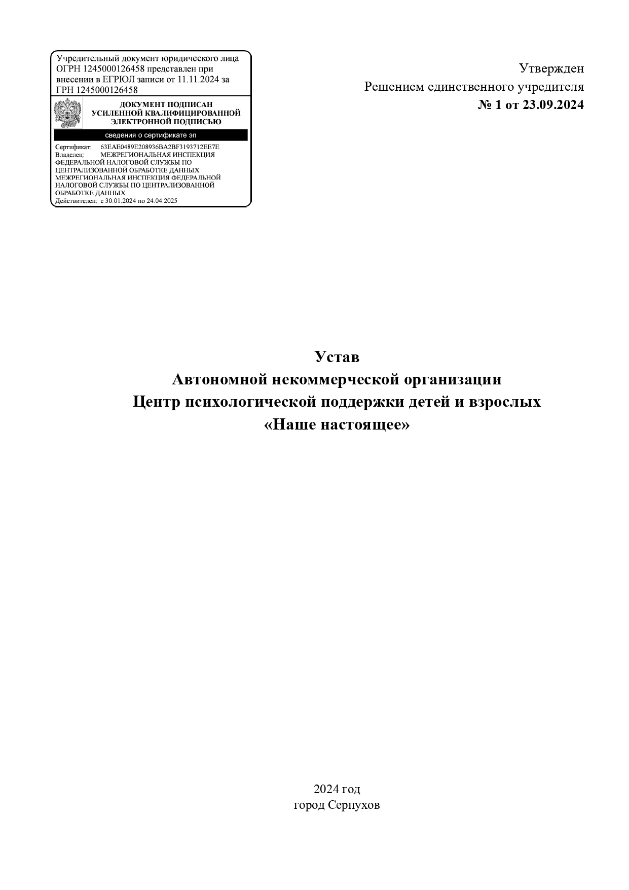 Полное наименование:Автономная некоммерческая организация Центр психологической поддержки детей и взрослых «Наше настоящее»